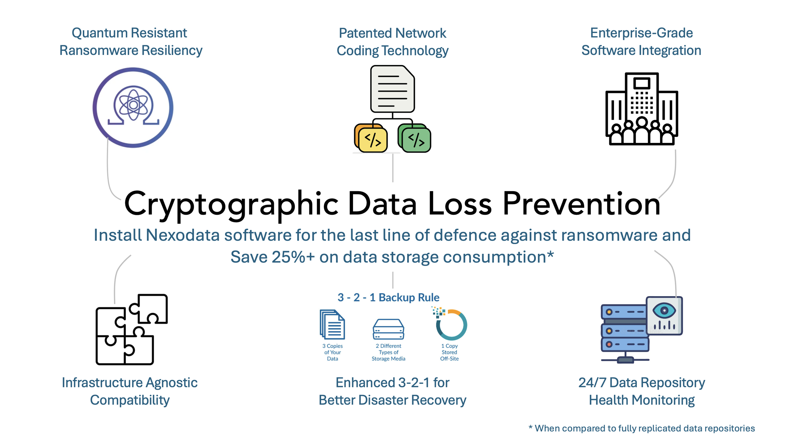 Data backup storage is a US$22B annual global industry with many established players in the market. Nexodata integrates seamlessly with a range of well-known software and hardware solutions. We upgrade your existing infrastructure to prevent data loss while providing 25% data storage efficiency gains. We comply with common industry standards allowing compatibility and easy onboarding.